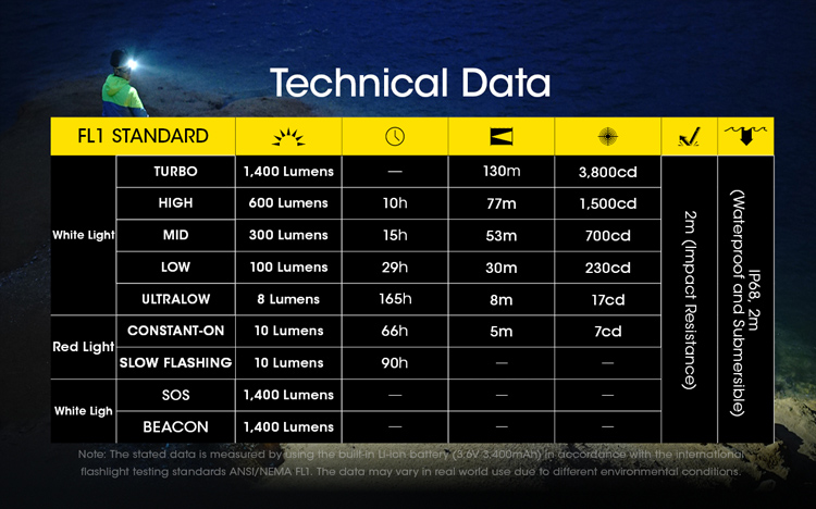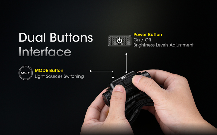 В NU34 три типа светодиода. Основной светодиод 1400 люмен. Вторичные светодиоды: CRI с максимальной мощностью 35 люмен (позволяет без нагрузки на глаза читать книги или заниматься делами, требующих естественного освещения). Так же, есть два красных светодиода, которые могут сэкономить заряд аккумулятора, и в то же время не напрягать глаза.