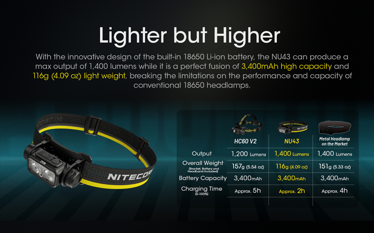 Новая модель мощного налобного фонаря NU43 с возможность его зарядки с помощью USB. Встроенный литиево-ионный аккумулятор имеет ёмкость в 3400mAh, такая емкость обеспечит время работы фонаря 165 часов. Зарядка происходит с помощью USB-порта, который находится в боковой части корпуса.