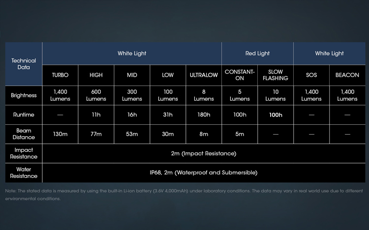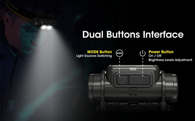 В NU50 три типа светодиода. Основной светодиод 1400 люмен. Вторичные светодиоды: CRI с максимальной мощностью 35 люмен (позволяет без нагрузки на глаза читать книги или заниматься делами, требующих естественного освещения). Так же, есть два красных светодиода, которые могут сэкономить заряд аккумулятора, и в то же время не напрягать глаза.