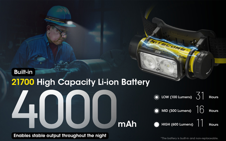 Новая модель мощного налобного фонаря NU50 с возможность его зарядки с помощью USB. Встроенный литиево-ионный аккумулятор 21700 имеет ёмкость в 4000mAh, такая емкость обеспечит время работы фонаря 180 часов. Зарядка происходит с помощью USB-порта, который находится в боковой части корпуса.